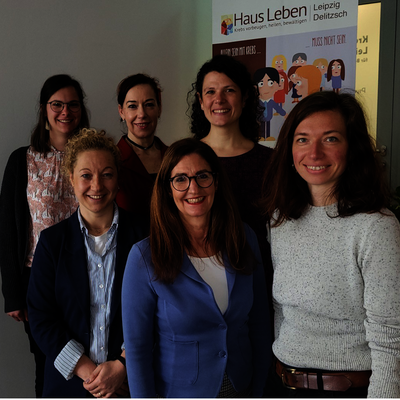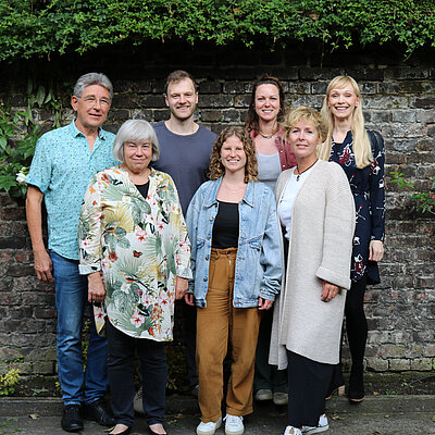 Eine Gruppe von fünf Frauen und zwei Männern lachen in die Kamera